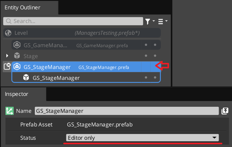 - Enter prefab edit mode. Set the wrapper entity (parent of your Manager entity) to Editor Only. Save.