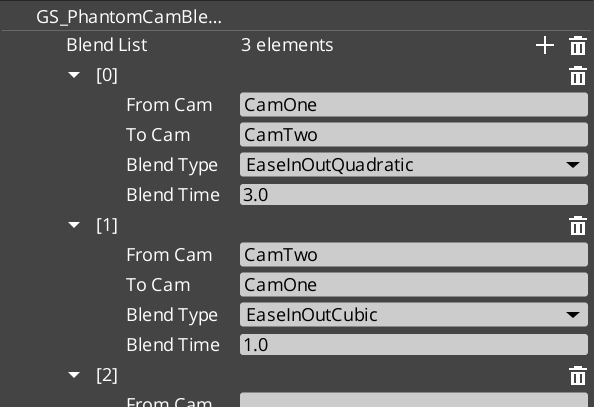 In each blend you can set the From target camera, the To target camera, and blending details. The Camera Names are the entity names you set up on your Phantom Camera Entities.