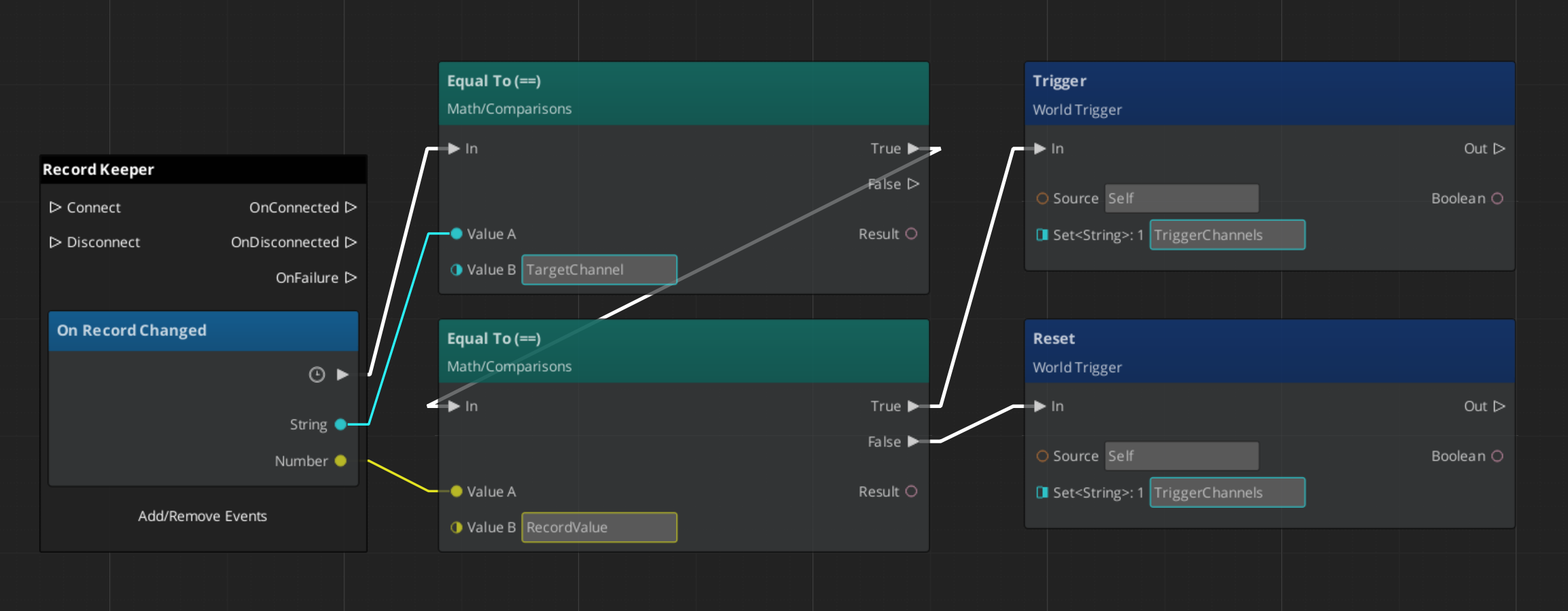 TriggerType_SetRecord | Writes a value to the Record Keeper by name. | Useful for setting quest flags, unlock states, or counters. |