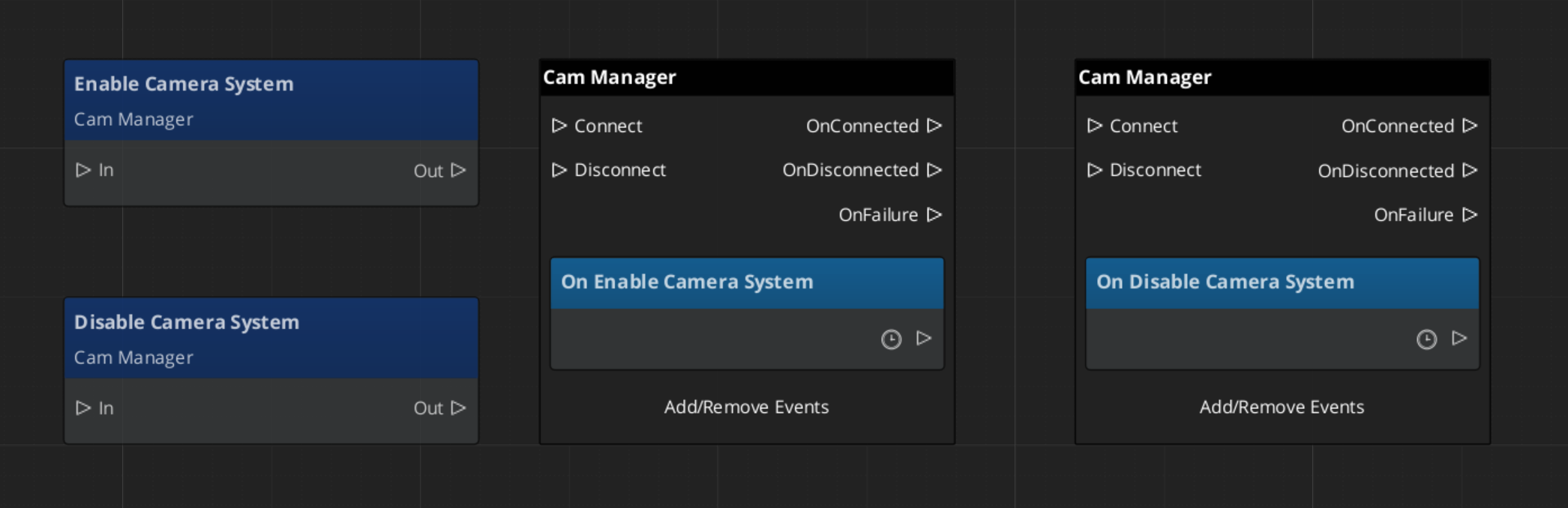 Both events are on CamManagerNotificationBus. Broadcast them to switch the camera system state from any script or component.