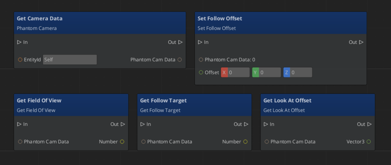 | Read a camera’s full configuration | PhantomCameraRequestBus(id) | GetPhantomCamData |