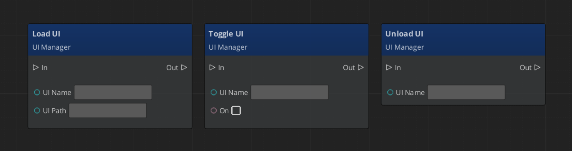 ToggleUI(name, on) | Shows or hides a canvas without changing the focus stack. |