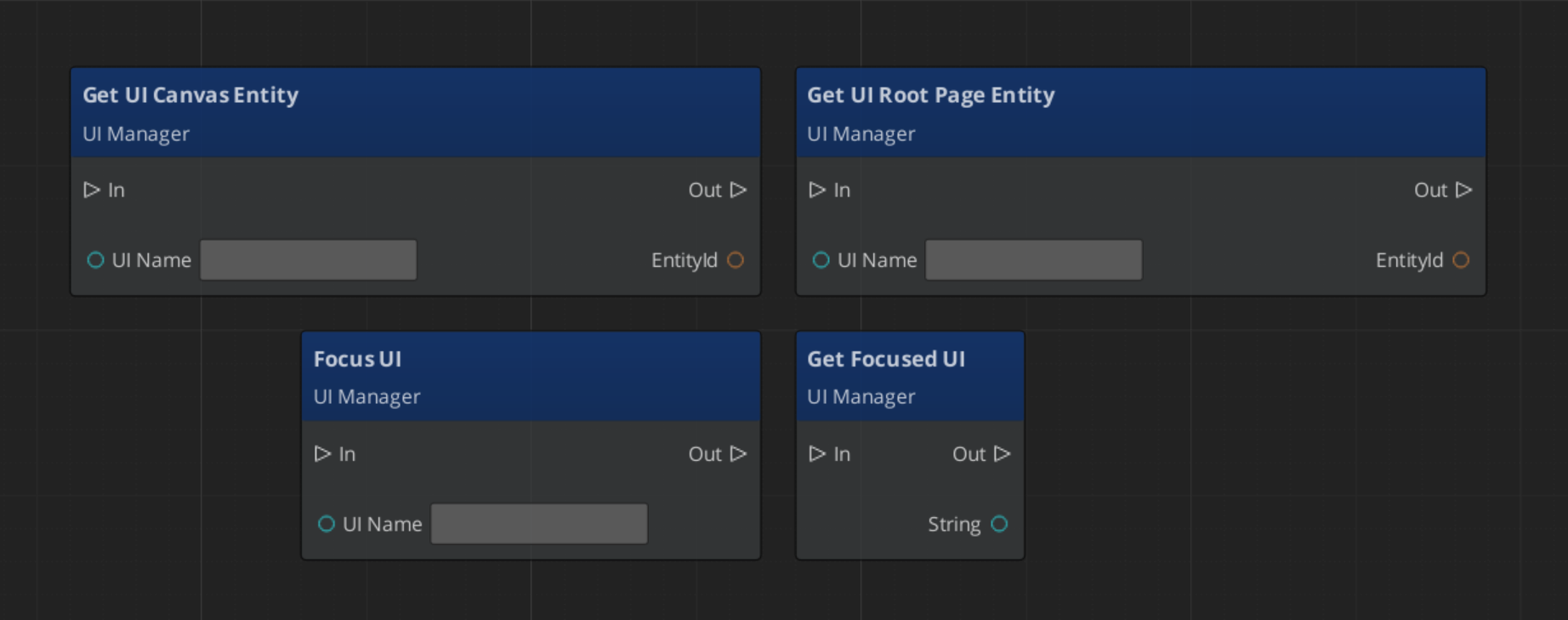 | Get focused canvas name | UIManagerRequestBus | GetFocusedUI |