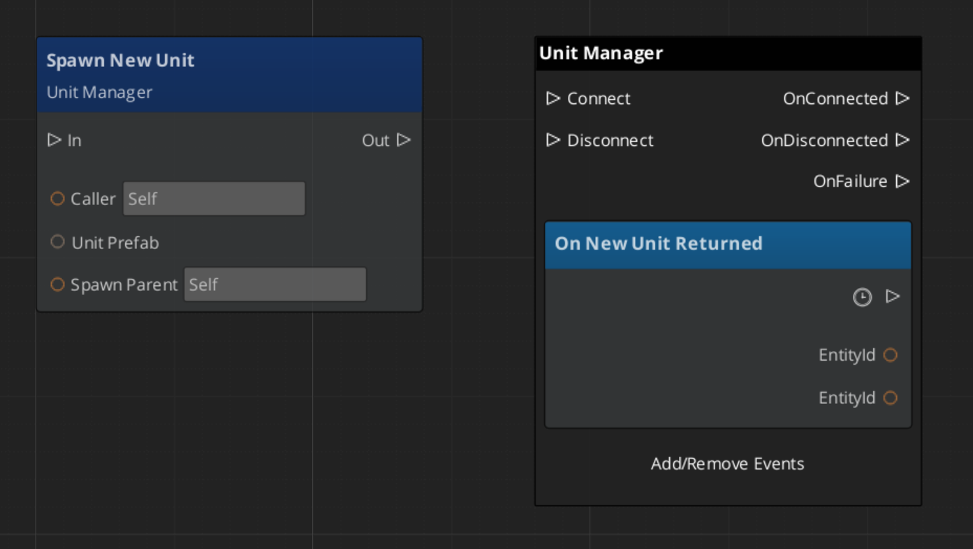 | Spawning | Issues RequestSpawnNewUnit and fires ReturnNewUnit when the entity is ready. |